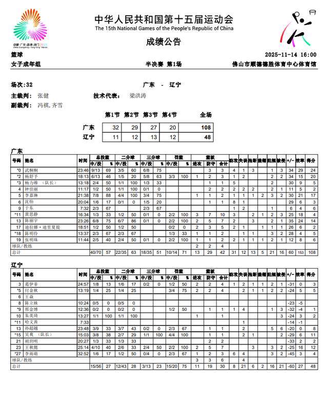 到了最后一节,广东队维持着50+的领先优势,丝毫不给辽宁队缩小分差的机会,并不领先拉大到60+。最终,广东全运女篮以108-48大胜辽宁队60分,率先打决赛,静待四川与江苏之间的胜者。