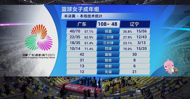 108-48!广东全运女篮太猛了,在十五运女篮成年组半决赛中,郑薇的队伍狂赢辽宁女篮60分,辽粤大战,再次以辽宁队失利而告终。武桐桐爆发,独砍24分,杨舒予20分。