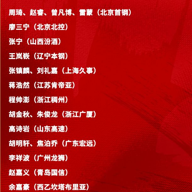 2025年全运男篮赛事落幕后,中国篮协官宣最新一期中国男篮19人集训大名单,北京首钢4大主力周琦、赵睿、曾凡博、雷蒙入选,成为CBA球队入选最多的一队,广东宏远的胡明轩与焦泊乔入选,辽宁本钢的王岚嵚入选,遭遇伤病的赵继伟落选,在NBA征战的杨瀚森也未入选。