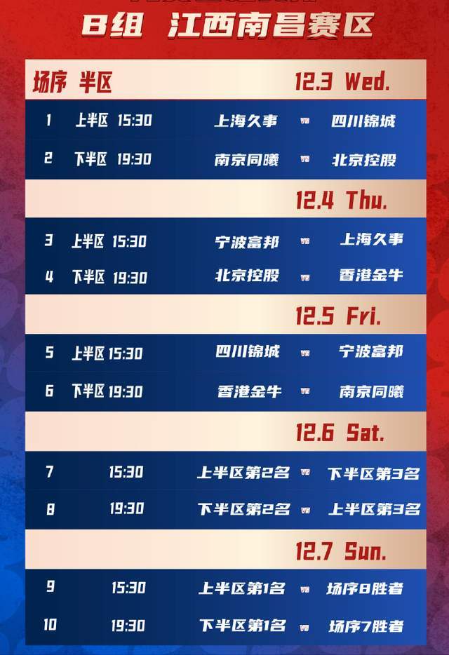 江西南昌赛区(B组):上海久事、南京同曦、宁波富邦、北京控股、四川锦城、香港金牛;